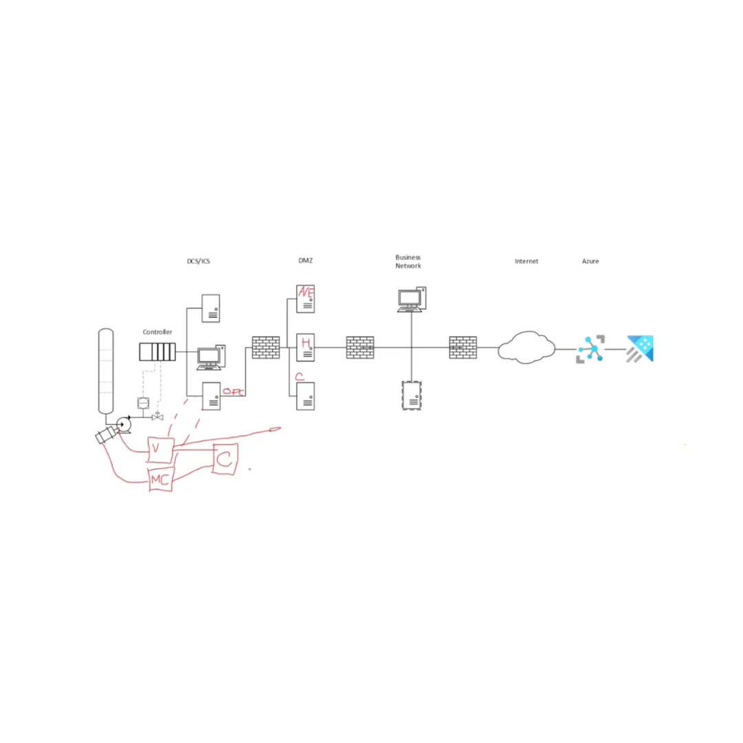 Located in the picture above, we have some industrial equipment, a pump, a motor, a flow meter, and a flow transmitter controller –that control the flow rate all as part of a distributed control system or industrial control system firewall. Then there is a demilitarized zone or DMZ Network. Then another firewall goes through the corporate business network. Then another firewall goes out to the internet and into Microsoft Azure or a specific cloud.