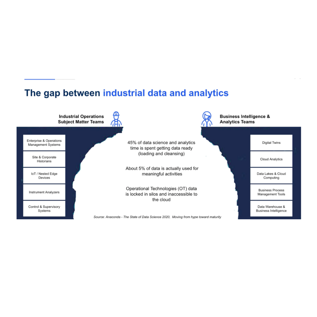 Look on the left-hand side of this photo; you can see a couple of different sources you can get information from. Most people are trying to get time series information from the site, corporate historians, or even the operations management systems. But in addition, we’ve seen a lot of new sources that people are using, for example, IoT devices and instrument analyzers. All of these data sources need to land in a place where the analytics team can access them efficiently, and the data quality and reliability are also intact.